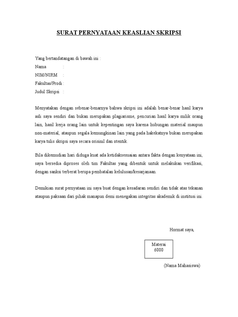 Contoh Surat Pernyataan Skripsi / Contoh Soal Dan Materi Pelajaran 2 Contoh Surat Pernyataan Skripsi : Ada banyak contoh surat pernyataan persetujuan yang bisa ditemukan dan ditiru.. Berbagai hal yang terkait dengan kepenulisan surat, baik yang bersifat pribadi maupun resmi, semuanya memiliki kriteria yang tepat agar surat bisa diterima oleh perusahaan atau lembaga yang. Isi surat pernyataan cerai berisi tentang pernyataan bahwa kedua belah pihak sepakat untuk bercerai. Bagaimana cara membuat surat pernyataan? Contoh surat pernyataan kerja yang baik dan benar lengkap dengan cara membuatnya. Dengan surat ini, kita dapat mengikat seseorang untuk keperluan sesuai dengan kasus atau pernyataan yang ingin di lakukan.